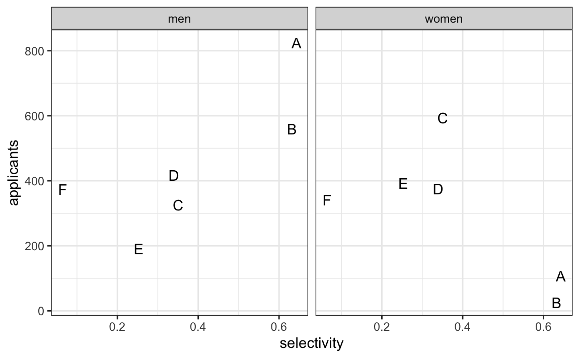 Here is an example in which we plot admissions stratified by major and show that women tend to apply to the more selective majors: