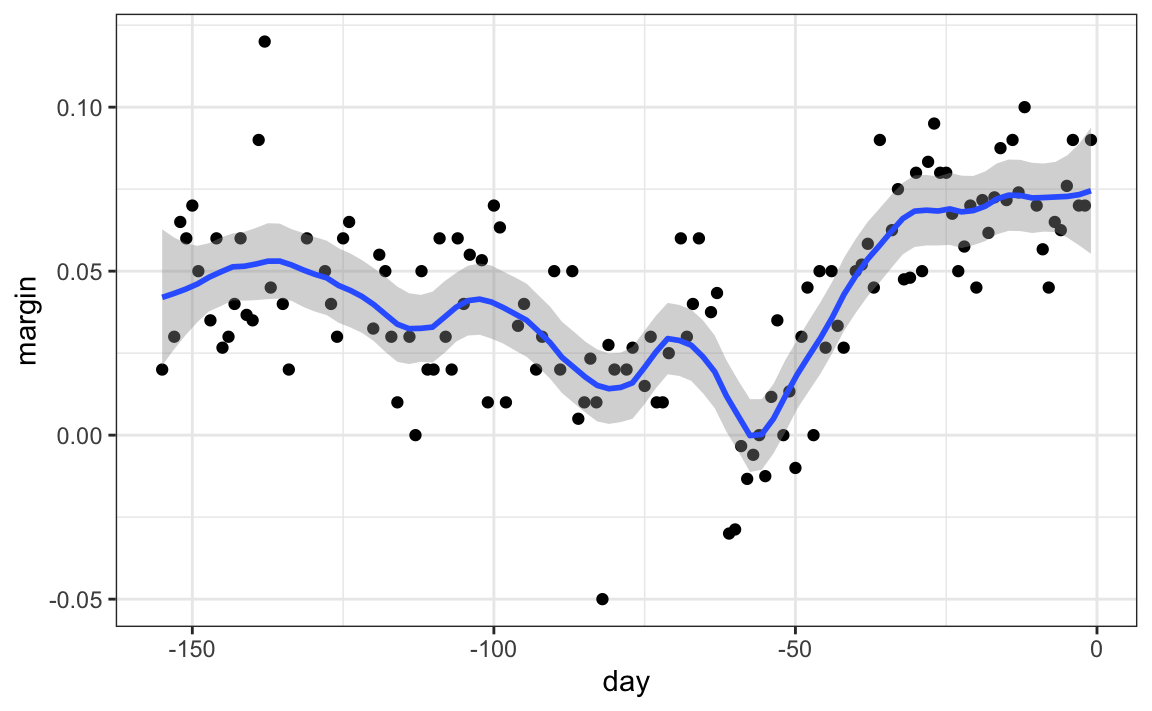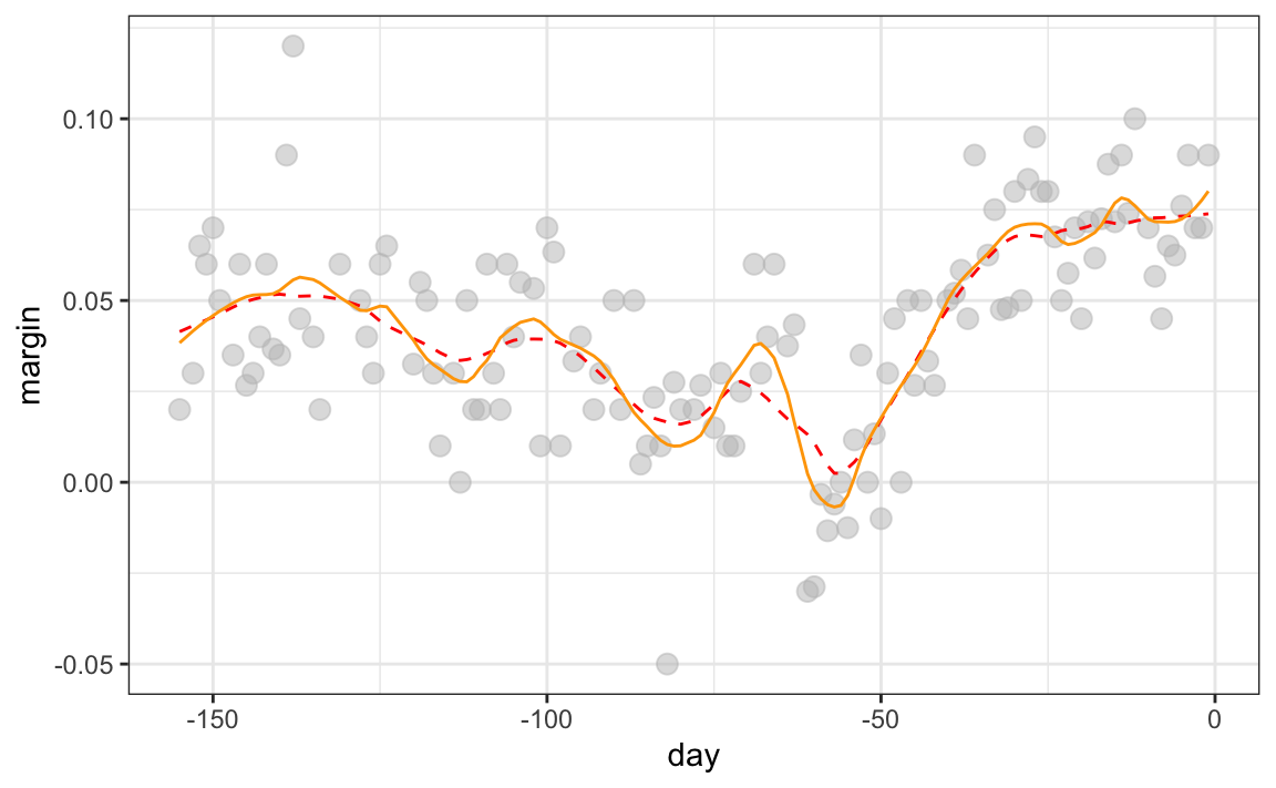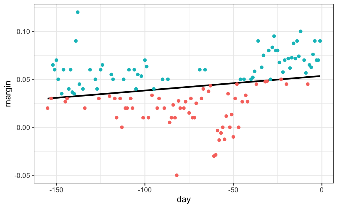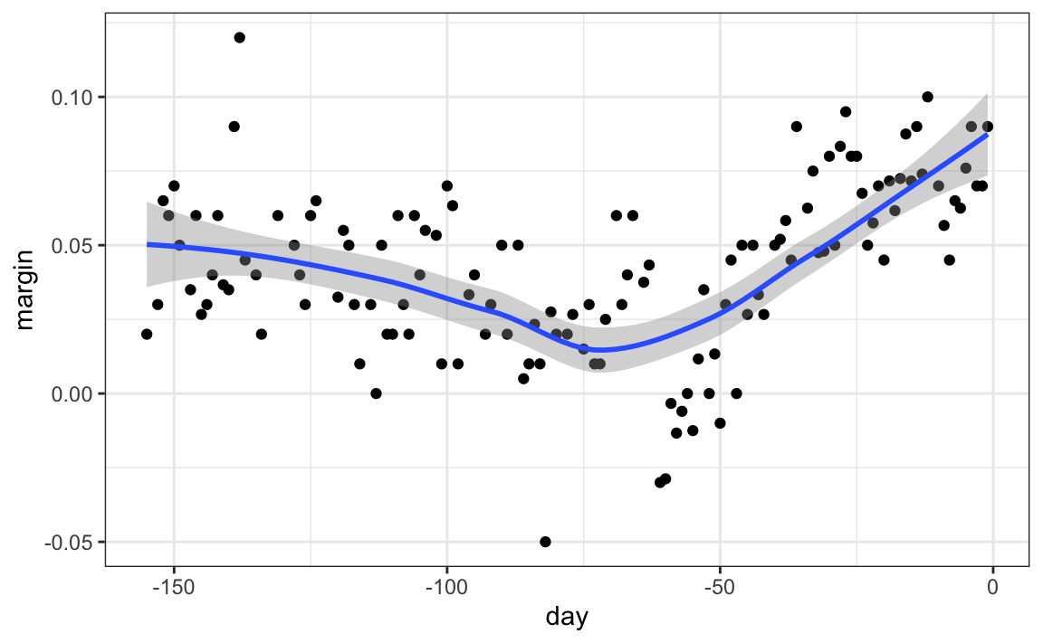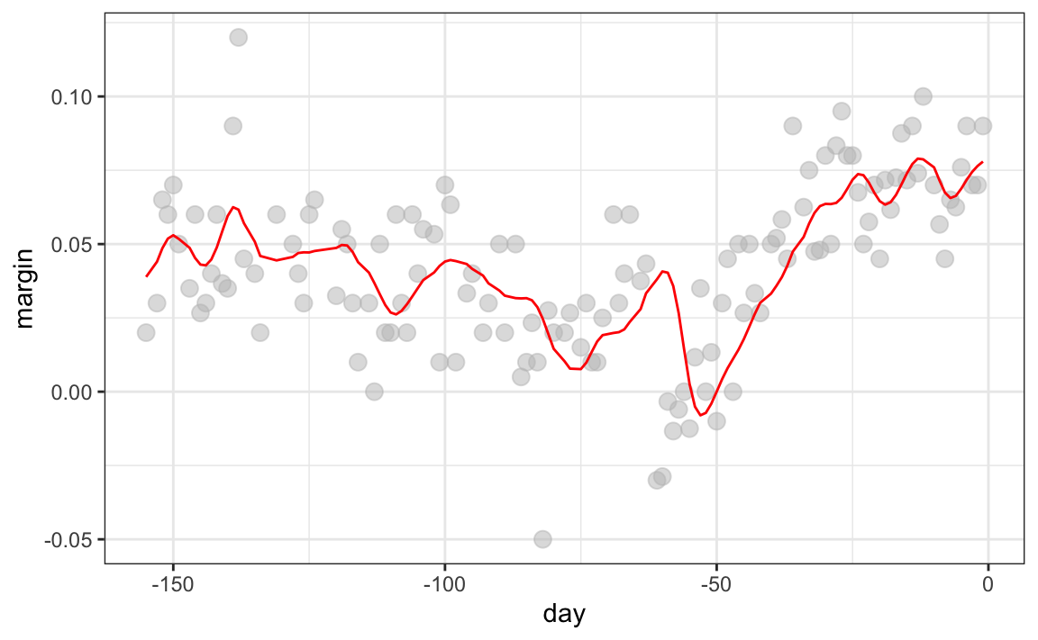 For the purposes of the popular vote example, do not think of it as a forecasting problem. Instead, we are simply interested in learning the shape of the trend once we have all the data.