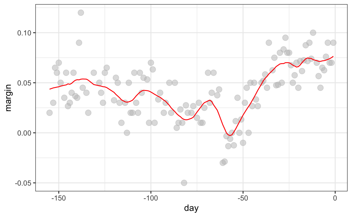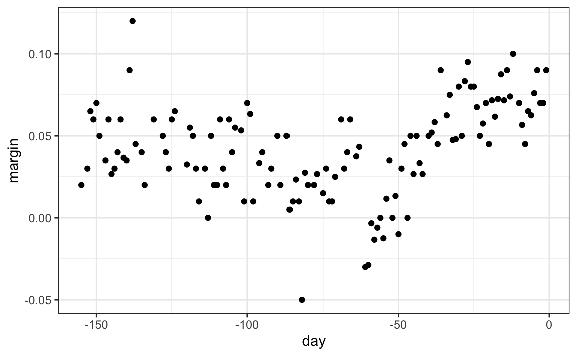 We assume that for any given day \(x\), there is a true preference among the electorate \(f(x)\), but due to the uncertainty introduced by the polling, each data point comes with an error \(\varepsilon\). A mathematical model for the observed poll margin is: