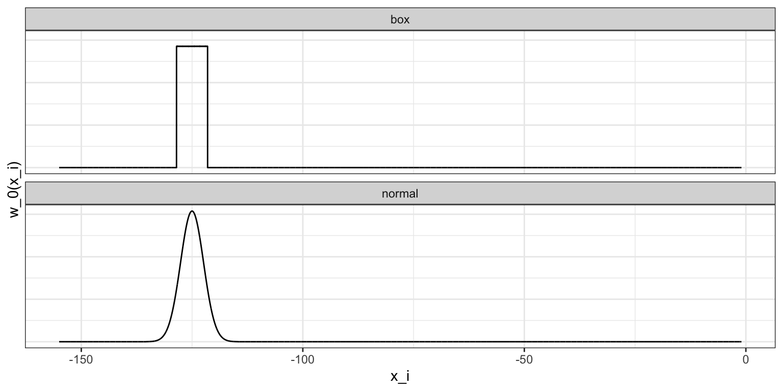 Below we visualize the box and normal kernels for \(x_0 = -125\) and \(h = 3.5\), showing how the boxcar kernel weighs all in-bin points equally, while the normal kernel downweights points near the edges.
