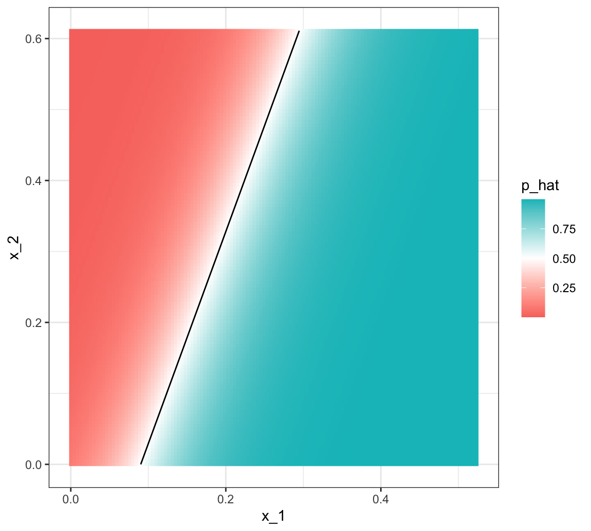\[ \hat{\beta}_0 + \hat{\beta}_1 x_1 + \hat{\beta}_2 x_2 = 0 \implies x_2 = -\hat{\beta}_0/\hat{\beta}_2 -\hat{\beta}_1/\hat{\beta}_2 x_1 \]