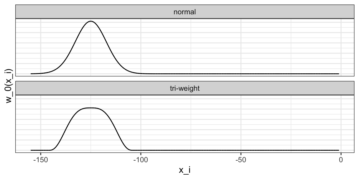 \[ w_{x_0}(x_i) = K\!\left(\frac{x_i - x_0}{h}\right), \]