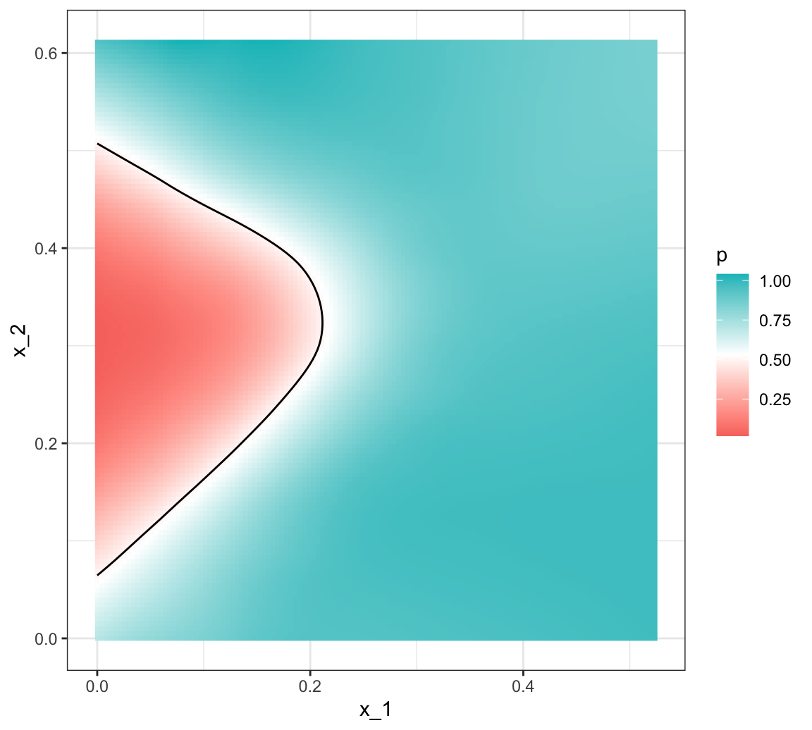 \[ p(\mathbf{x}) = \mathrm{Pr}(Y=1 \mid X_1=x_1 , X_2 = x_2). \]