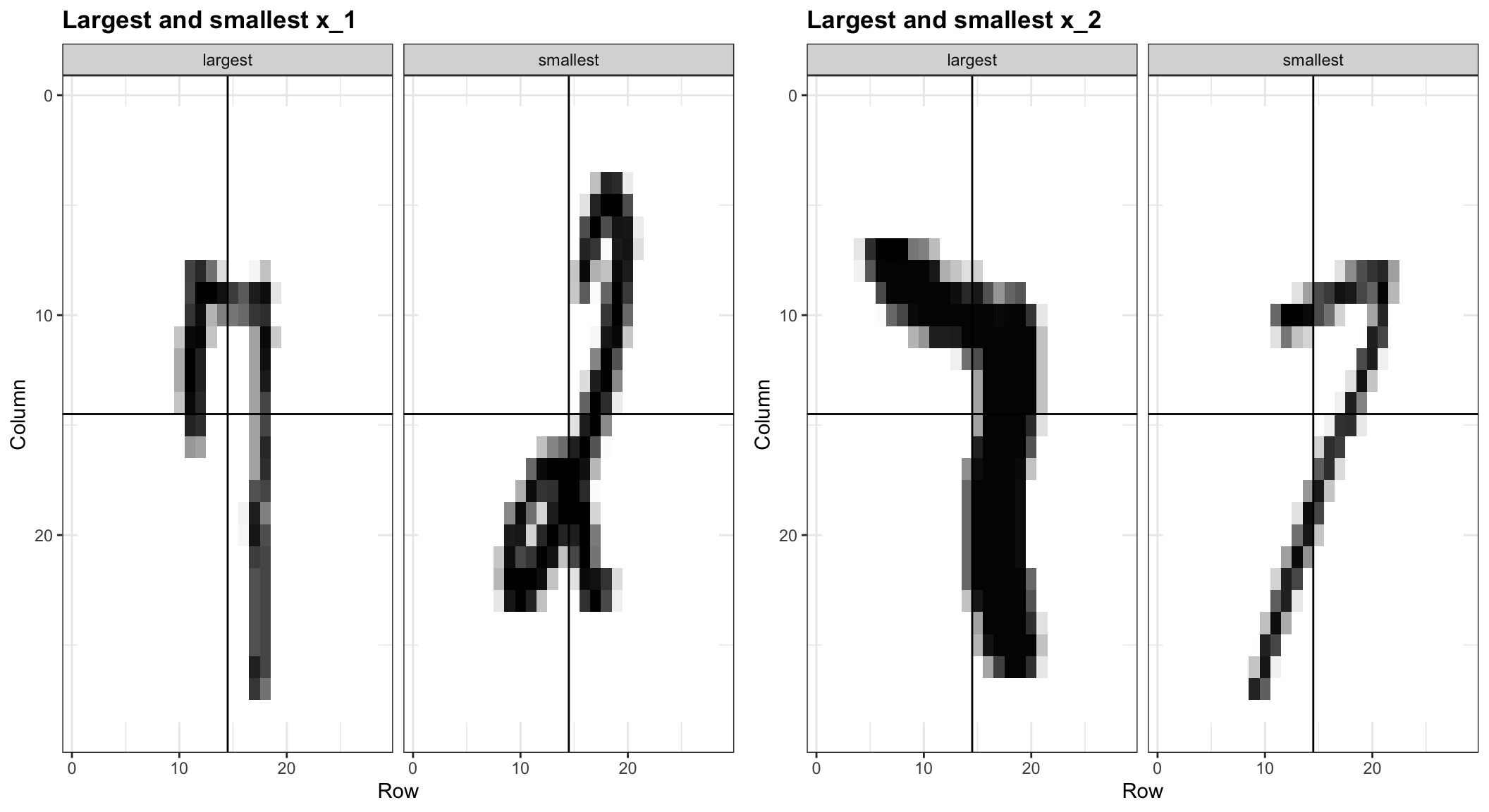 To illustrate how to interpret \(X_1\) and \(X_2\), we include four example images. On the left are the original images of the two digits with the largest and smallest values for \(X_1\) and on the right we have the images corresponding to the largest and smallest values of \(X_2\):