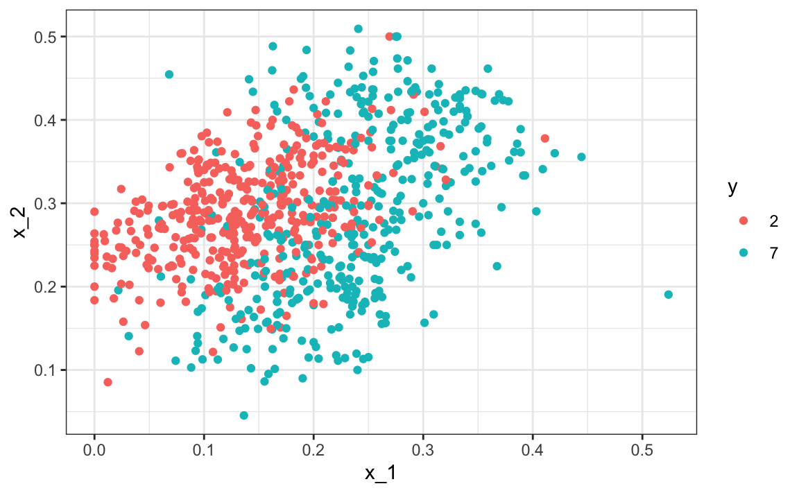 We can immediately see some patterns. For example, if \(x_1\) is large (there was a lot of ink in the upper-left part of the image), then the digit is probably a 7. Also, for smaller values of \(x_1\), the 2s appear to be in the mid range values of \(x_2\).