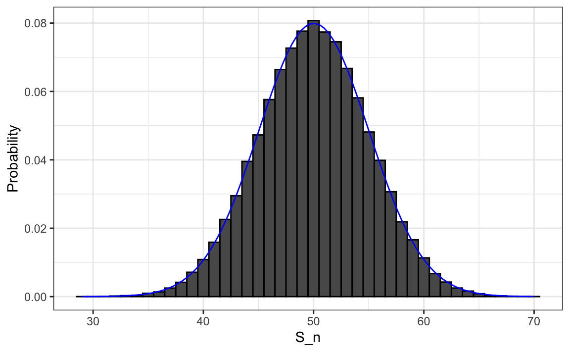#> [1] 0.028We can visualize the distribution of \(S_n\) with a histogram, overlaying the corresponding normal density curve for comparison: