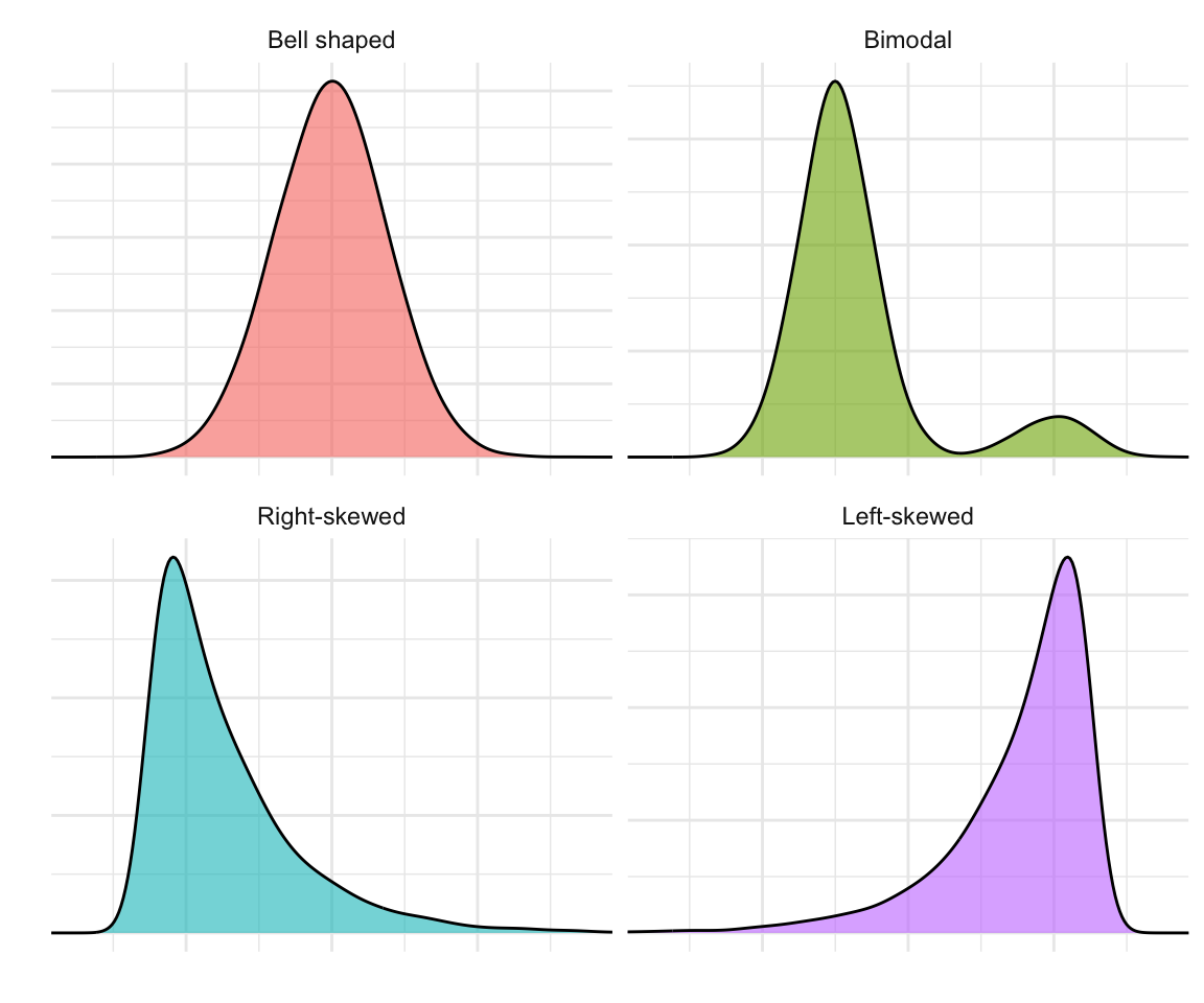 When visualizing data with a histogram or density plot, we often describe the shape of a distribution using a few key terms and concepts. In this section, our goal is simply to familiarize you with this vocabulary, terms that you’ll encounter in most discussions of data analysis.