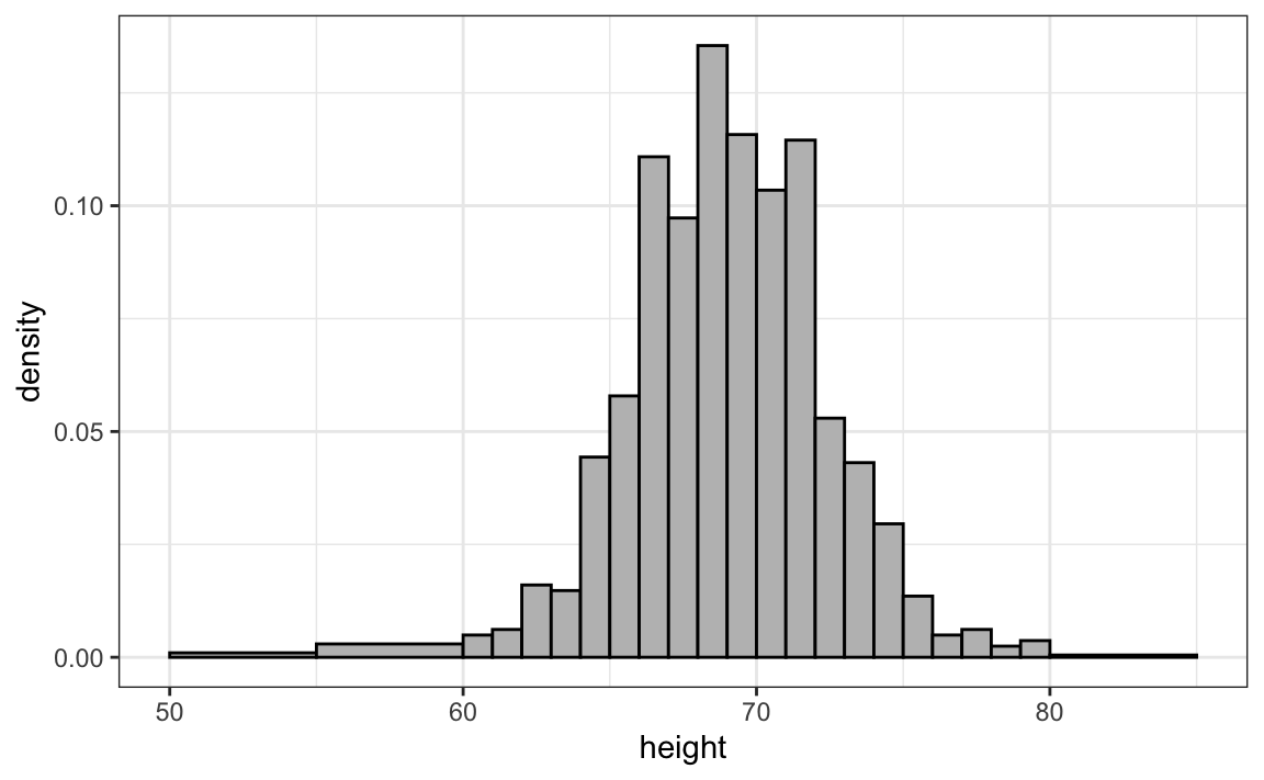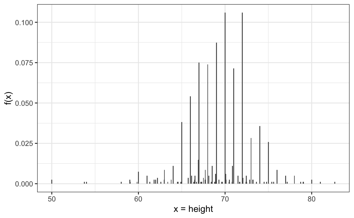 If we round the reported heights to the nearest inch and create a relative frequency distribution, we obtain a histogram with bins defined in one-inch intervals: