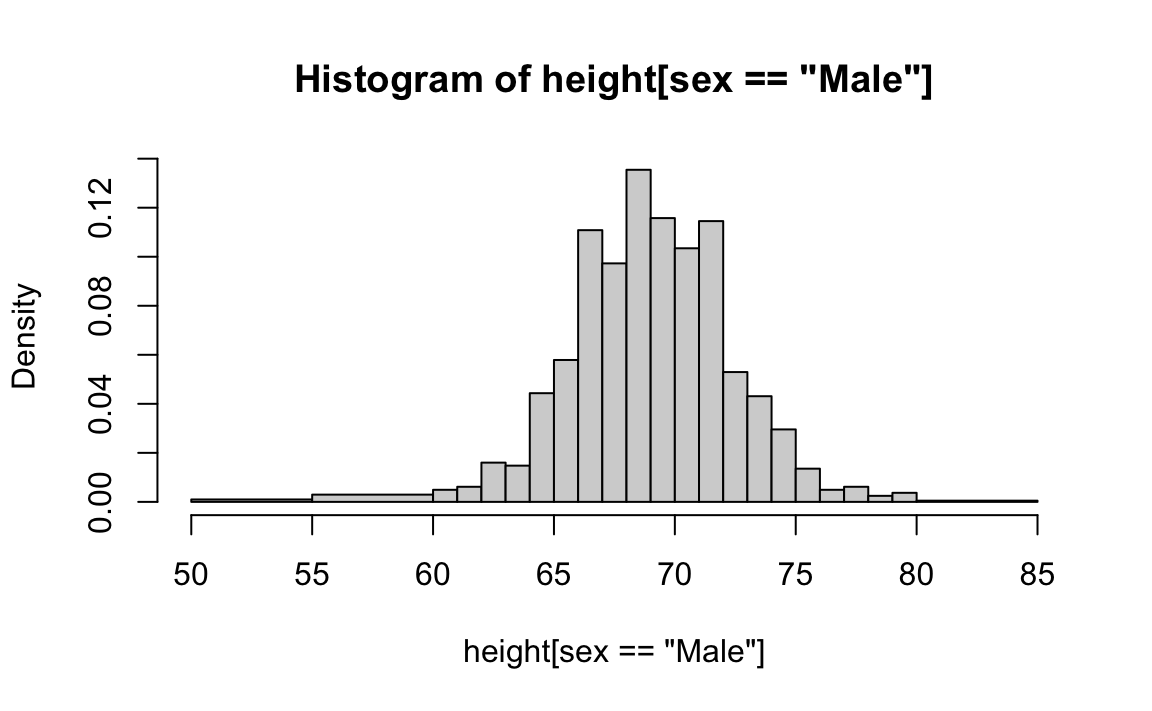 From a quick glance at the figure, we can already infer some general characteristics of the data. For example, about half of the males are shorter than 69 inches, since \(F(69) \approx 0.5\), and being shorter than 60 inches or taller than 80 inches is very rare. Moreover, because we can compute the proportion of individuals with heights between any two values \(a\) and \(b\) as \(F(b) - F(a)\), the plot above contains all the information needed to reconstruct the entire dataset.