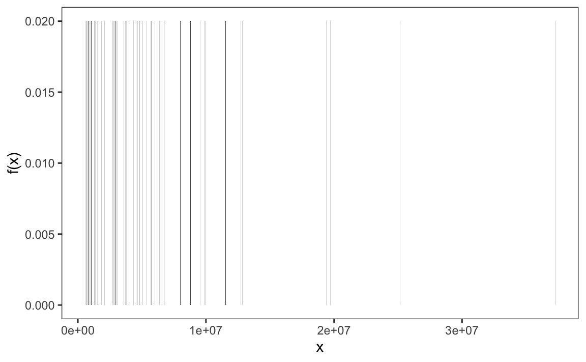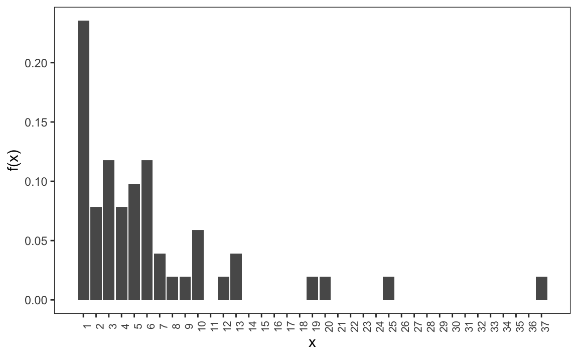 #> 0.18 0.32 0.24 0.26When the data are discrete numerical values, the relative frequency distribution is defined in the same way, except it is more common to use the following notation since the frequency can be considered a function of numerical values: