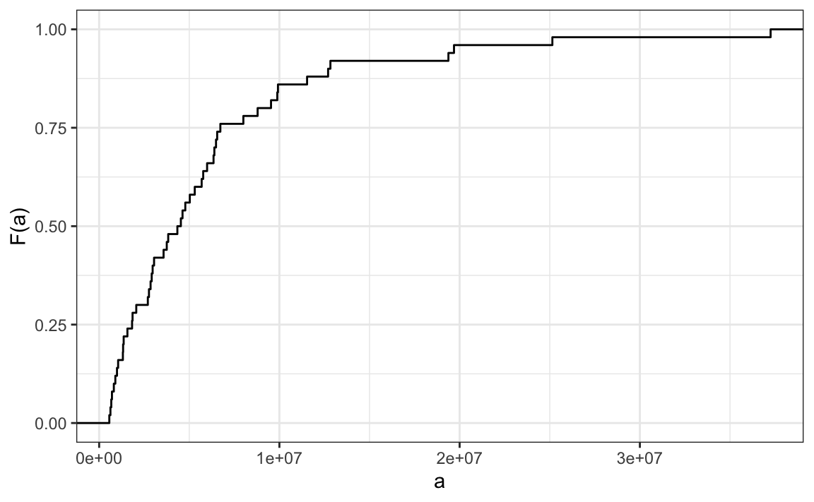 To define a distribution for continuous numeric data we define a function that reports the proportion of the data entries \(x\) that are below \(a\), for all possible values of \(a\). This function is called the empirical cumulative distribution function (eCDF) and often denoted with \(F\):