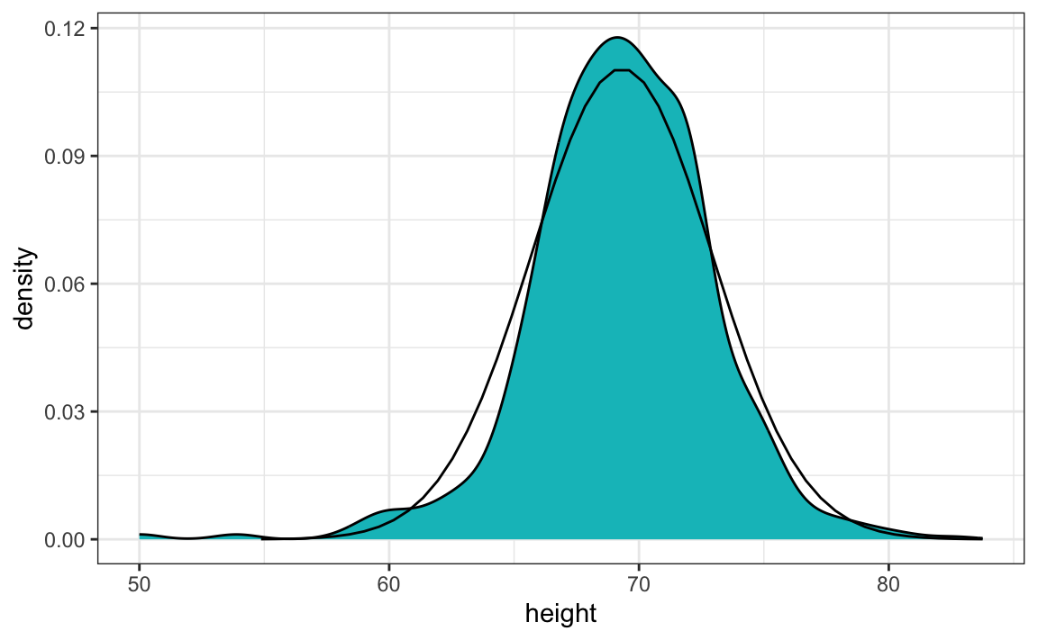When using the normal approximation with discrete data (for example, when heights are rounded to the nearest inch), note that mean(x < a) and mean(x <= a) may differ. In such cases, it’s common to apply a continuity correction, using pnorm(a + delta/2, m, s) to approximate mean(x <= a), where delta is the bin width (in our example, 1 inch). In our dataset, however, some students reported more precise measurements, so the degree of discretization varies. As a result, the normal approximation should be applied with care.