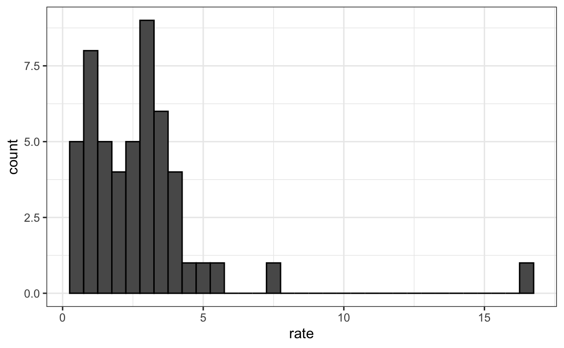 To introduce boxplots, we will use a dataset of U.S. murders by state. Suppose we want to summarize the distribution of murder rates. A histogram quickly reveals that the data are right-skewed, indicating that the normal approximation does not apply:
