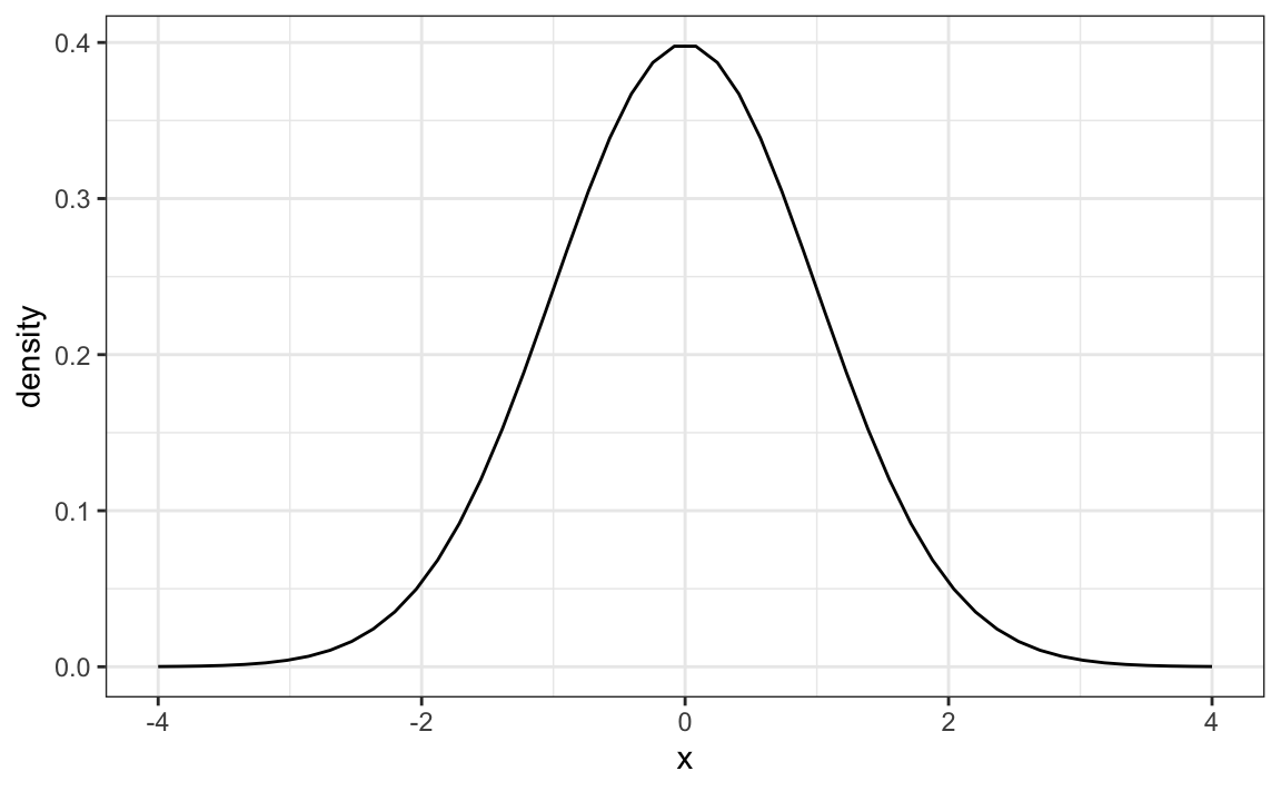 The distribution is symmetric, centered at \(\mu\), and most values (about 95%) are within \(2\sigma\) from \(\mu\). Here is what the normal distribution looks like when the \(\mu = 0\) and \(\sigma = 1\):