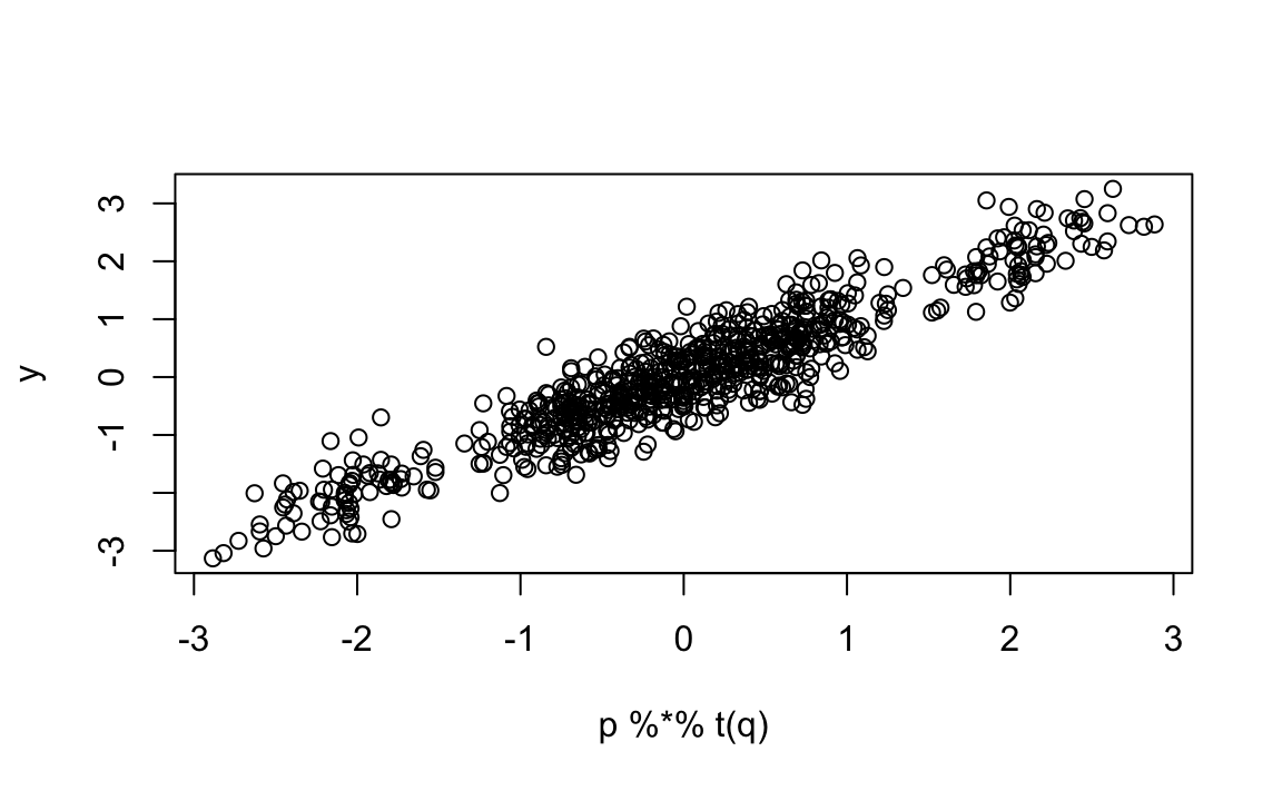 To see that we can approximate \(Y_{ij}\) with \(p_iq_j\) we convert the vectors to matrices and use linear algebra: